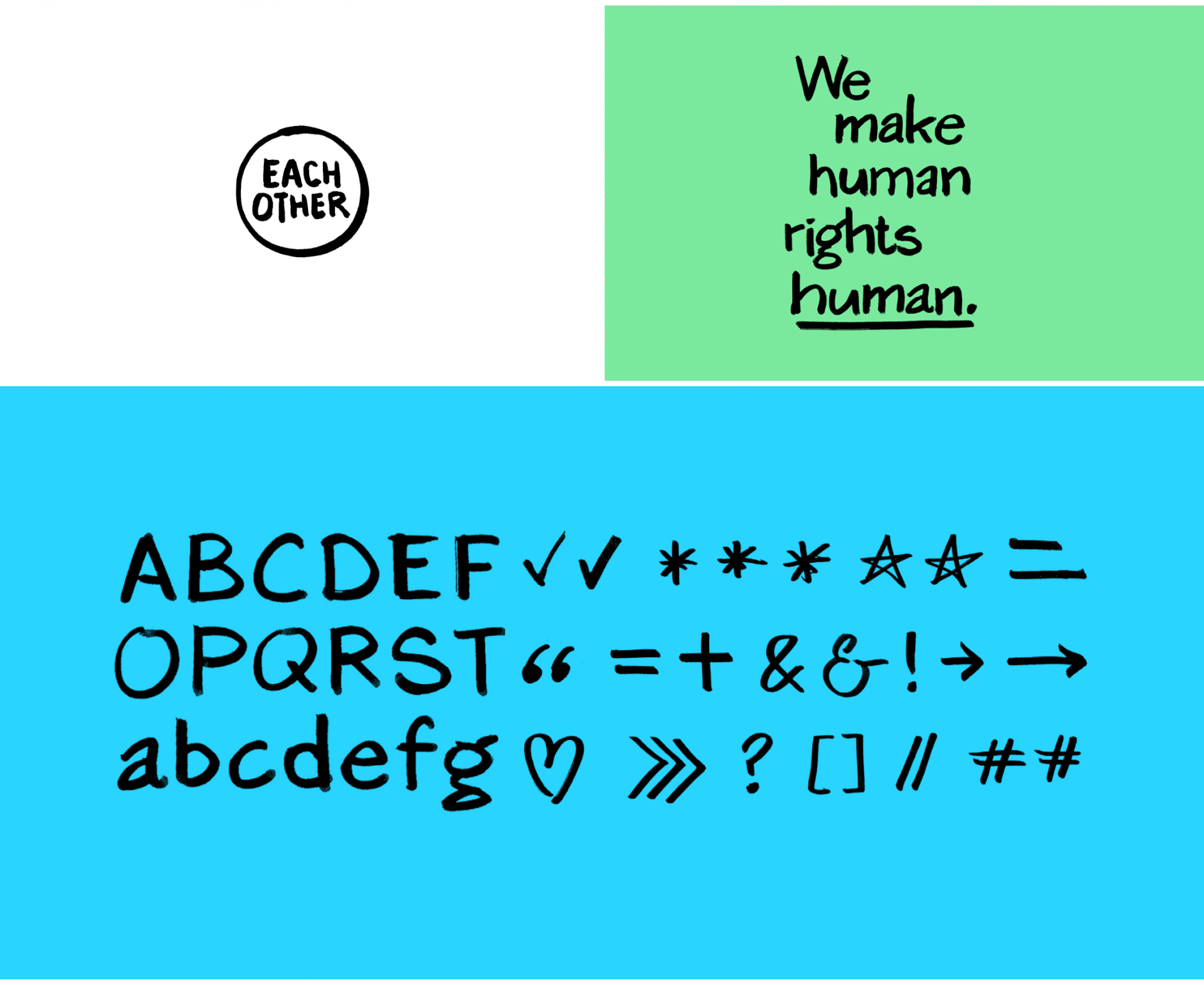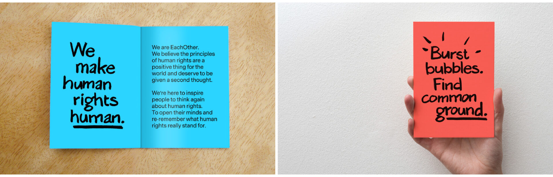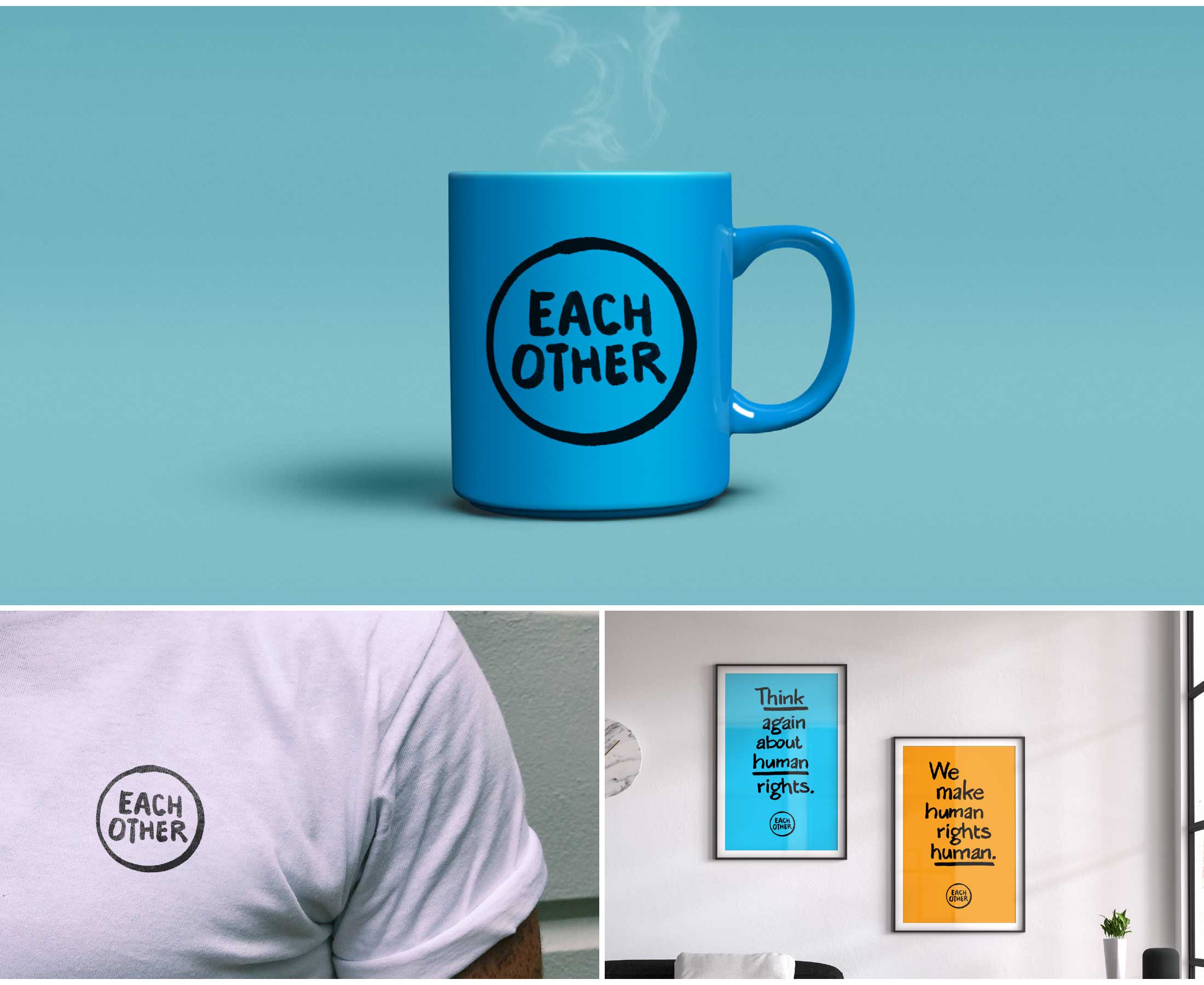 Matching the friendly, human and universal tone of the name, our new visual identity was designed around a bespoke hand drawn alphabet. This gave the tight-knit charity team a really practical tool they could use easily and quickly, giving them instant stand out in their sector and delivering the spirit of the new positioning. We pinpointed a set of fresh, bright colours to bring impact and energy. We wanted EachOther to be the most all embracing, universally appealing human rights organisation out there… as comfortable in the world of the Daily Mail as in that of the Guardian.