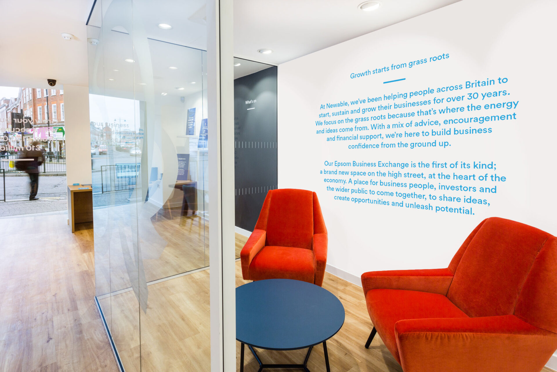 Newable’s purpose is to unleash potential at the heart of the economy, helping businesses with finance, advice and space. As part of their innovation programme, the leadership team wanted to explore new ways to reach local businesses. We worked together to develop a Newable high street concept – The Business Exchange – where local people can connect to local investors and get expert support. We launched the first location in 2017 on Epsom’s high street.